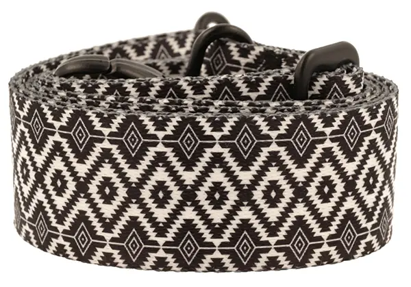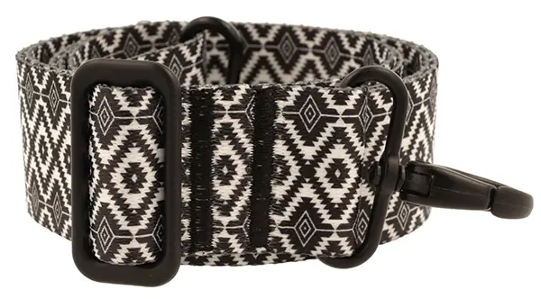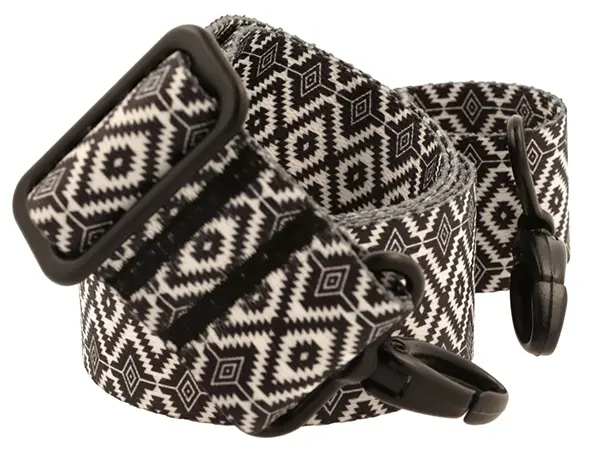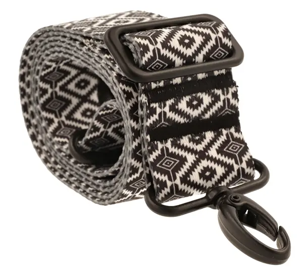 Pasek do torebki z wyrazistym, geometrycznym wzorem. Wzór składa się z powtarzających się białych i czarnych rombów, ułożonych w regularne, poziome pasy. Każdy romb jest oddzielony od siebie cienkimi liniami, co tworzy iluzję głębi i trójwymiarowości. Wzór jest symetryczny i precyzyjny, z czarnymi rombami wydającymi się być na pierwszym planie, a białymi trochę cofniętymi. Kontrastowe barwy sprawiają, że wzór jest bardzo dynamiczny i zauważalny, co może przyciągać wzrok i dodać charakteru każdej torebce, do której będzie przyczepiony.