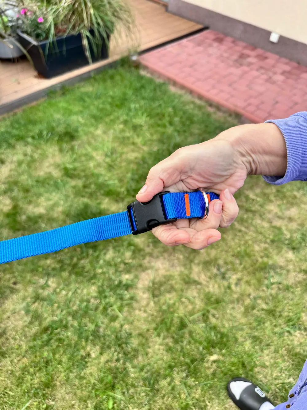 - Trzymanie w ręku – klasyczny sposób prowadzenia psa, idealny na krótkie spacery po parku czy po mieście. Smycz wygodnie leży w dłoni, a jej solidna taśma zapewnia pewny chwyt.