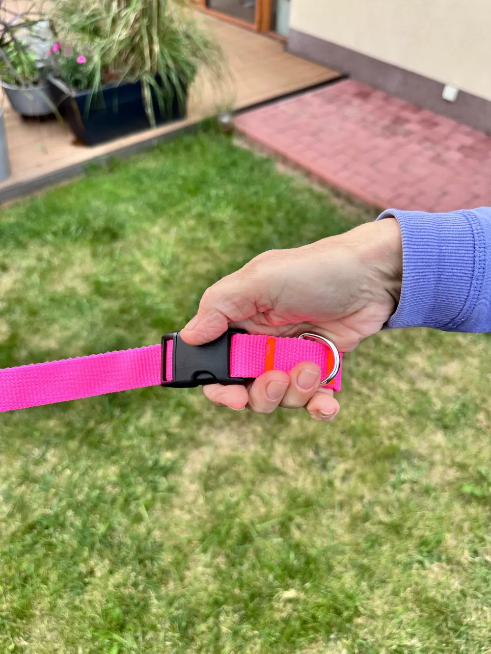 - Trzymanie w ręku – klasyczny sposób prowadzenia psa, idealny na krótkie spacery po parku czy po mieście. Smycz wygodnie leży w dłoni, a jej solidna taśma zapewnia pewny chwyt.