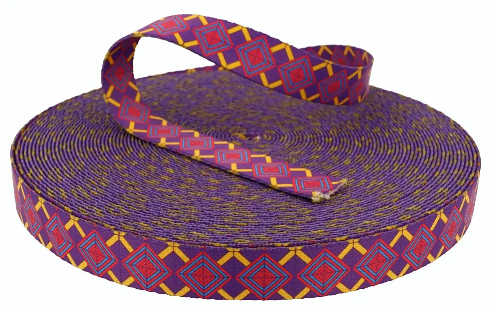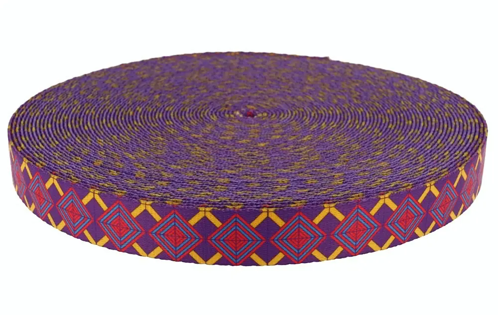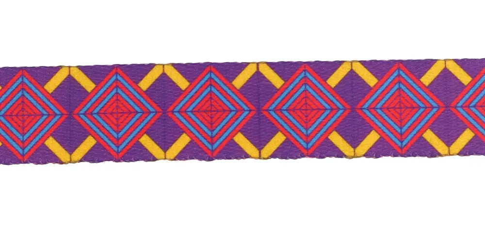 Wzór na tej taśmie przedstawia powtarzalne, złożone motywy geometryczne, które tworzą kolorową i symetryczną sekwencję wzorów. Centralne elementy wzoru są rombami złożonymi z koncentrycznych, wielokolorowych trójkątów w odcieniach czerwieni i niebieskiego, umieszczone na tle intensywnie fioletowej taśmy. Każdy romb jest oddzielony żółtymi i pomarańczowymi pasami, co dodatkowo podkreśla intensywność i energię tego wzoru. Całość komponuje się w wyrazisty i radosny design, który może dodać życia i charakteru każdemu produktowi, do którego zostanie zastosowany, idealnie nadając się na akcesoria odzieżowe, dekoracje wnętrz lub elementy hobbystyczne.
