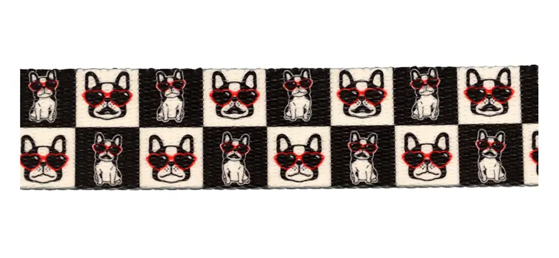 Wzór składający się z symetrycznego układu grafik przedstawiających głowy buldoga francuskiego. Psy są przedstawione w dwóch wersjach kolorystycznych: jedne mają uszy i okulary w kolorze czerwonym, inne bez okularów z uszami w kolorze naturalnym. Tło jest podzielone na czarno-białe kwadraty, co nadaje wzorowi szachownicę, przypominającą klasyczny wzór vichy. Całość ma bardzo uporządkowany i powtarzalny charakter, z kreskówkowym urokiem, który może przemawiać do miłośników tej rasy psów.