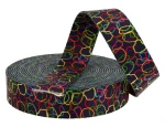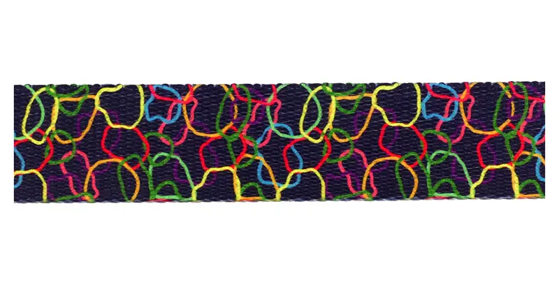Wzór na taśmie to kolorowe, splecione ze sobą kształty przypominające łańcuchy lub gumki recepturki. Łańcuszki mają różne odcienie i kolory takie jak żółty, zielony, czerwony, niebieski i różowy, co nadaje im wesoły i żywy charakter. Tło taśmy jest ciemne, co jeszcze bardziej podkreśla intensywność i jasność kolorów łańcuszków. Rozmieszczenie kształtów jest luźne i zdaje się być przypadkowe, co dodaje wzorowi dynamiki i sprawia, że jest on energetyczny i radosny w wyrazie.