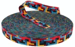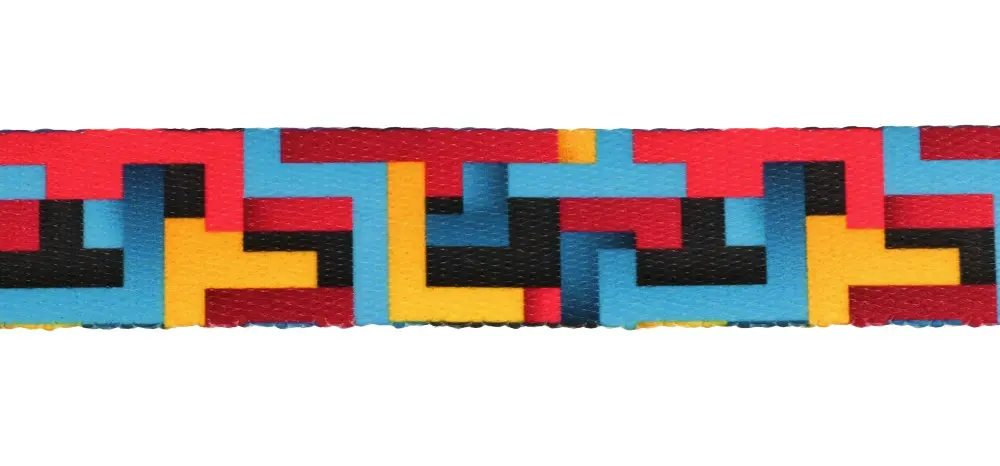 Wzór na tej taśmie to wyrazista i kolorowa kompozycja geometryczna, składająca się z łączących się prostokątów i kwadratów, ułożonych w labiryntową sekwencję. Motyw charakteryzuje się intensywnym zderzeniem kolorów: czerwieni, niebieskiego, żółtego, oraz czerni, które są zestawione w taki sposób, aby tworzyć wyraźne, zdecydowane bloki kolorystyczne. Ta kolorystyka i układ wzoru dodają taśmie nowoczesnego, prawie cyfrowego charakteru, który może być szczególnie atrakcyjny w akcesoriach modowych, projektach dekoracyjnych, a także w elementach graficznych użytkowych produktów, takich jak torby, plecaki czy akcesoria sportowe. Wzór ten jest idealny dla tych, którzy szukają odważnych, wyrazistych elementów, aby dodać dynamicznego charakteru swoim projektom.