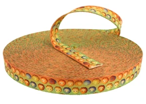 Wzór "Bearcade" to czarująca taśma ozdobna pełna wizerunków małych, kolorowych misiów. Te radosne maskotki, ułożone w regularne sekwencje, oferują szeroką paletę barw, od żywej pomarańczy po soczystą zieleń, tworząc kolorowy kalejdoskop. Każdy miś jest starannie odwzorowany, z wyraźnymi detalami jak okrągłe oczy i urocze uśmiechy, co nadaje im osobowość i czyni wzór wyjątkowo przyjaznym. Tło taśmy przeplata się w odcieniach ciepłej pomarańczy i jasnej żółci, co sprawia, że wzór "Bearcade" emanuje ciepłem i pozytywną energią. Jest to idealny wybór dla wszelkiego rodzaju akcesoriów dziecięcych, rękodzieła i wszędzie tam, gdzie pragnie się dodać odrobinę uroku i zabawy.