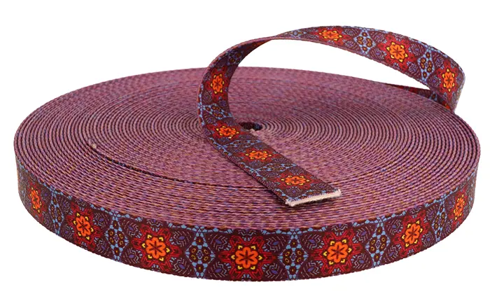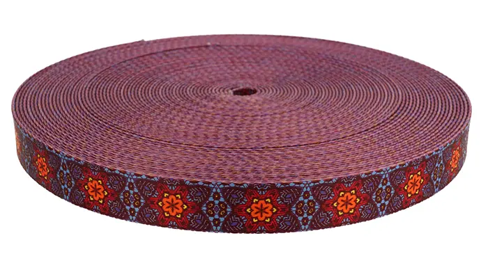 Wzór na taśmie przedstawia bogate, wielobarwne ornamenty, które przywodzą na myśl tradycyjne tkaniny ręcznie robione. Na ciemnym tle taśmy pojawiają się powtarzające się motywy kwiatowe i roślinne w odcieniach czerwieni, pomarańczy i niebieskiego, otoczone delikatnymi liniami w kształcie liści i winorośli. Te drobne, ale wyraźne akcenty kolorystyczne na ciemnym tle tworzą efekt głębi i tekstury. Całość kompozycji ma charakter etniczny i przypomina kunsztowną mozaikę, która jest zarówno klasyczna, jak i ekspresyjna, nadając taśmie unikalny i rozpoznawalny charakter.