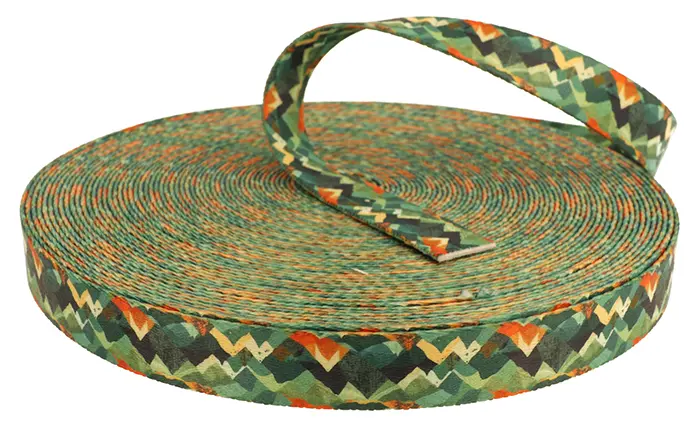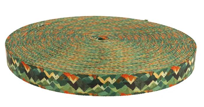 Wzór "Peak" to taśma ozdobna, na której wyeksponowano abstrakcyjną interpretację górskiego krajobrazu. Kształty w formie zygzaków w harmonijnych odcieniach zieleni, brązu i kremu układają się w serię szczytów i dolin, tworząc rytmiczny wzór przypominający wzgórza i górskie łańcuchy. Kontrastowe barwy odwzorowują różnorodność natury i jej warstwową strukturę, od nizinnych dolin po wysokie szczyty. "Peak" jest idealnym wyborem dla tych, którzy szukają sposobu na wprowadzenie do swoich projektów czy akcesoriów elementu przygody i majestatu górskich pejzaży, dodając odrobinę dzikości i inspiracji naturą.