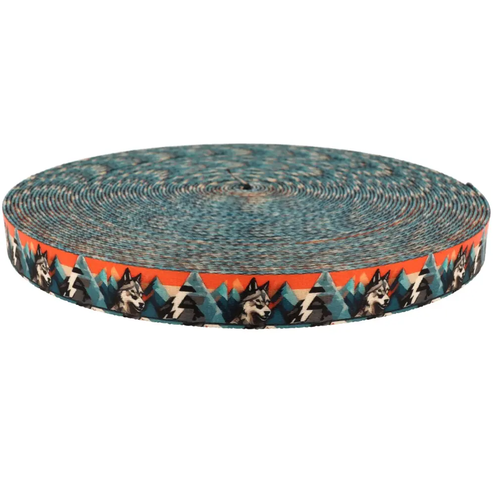 Wzór na tej taśmie przedstawia majestatyczny krajobraz górski z dominującymi sylwetkami wilków. Na pierwszym planie znajdują się realistyczne wizerunki wilków, które dodają wzorowi dzikiego i naturalnego charakteru. W tle rozciąga się pasmo górskie w odcieniach błękitu i szarości, a niebo nad górami przybiera intensywny pomarańczowy kolor, co sugeruje zachód słońca.