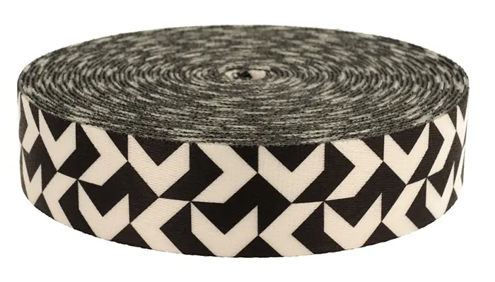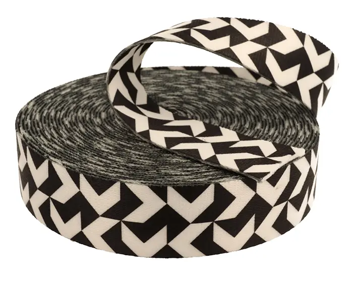 Taśma z wyrazistym, geometrycznym wzorem. Wzór składa się z serii czarnych i białych zygzaków, które tworzą powtarzający się, zębaty motyw. Kształty przypominające strzałki lub ostre góry ułożone są w linię, tworząc rytmiczny i graficzny wzór, który ma współczesny i odważny charakter. Kontrast między czernią a bielą dodaje wzorowi wyrazistości i sprawia, że jest on łatwo rozpoznawalny i może stanowić silny element dekoracyjny. Wzór ten może być interpretowany jako nowoczesna interpretacja tradycyjnych motywów plemiennych lub inspirowany sztuką op-artu, dając efekt wizualnej głębi i ruchu.
