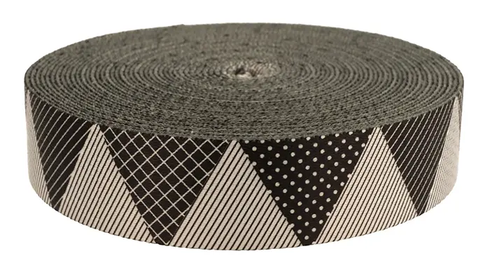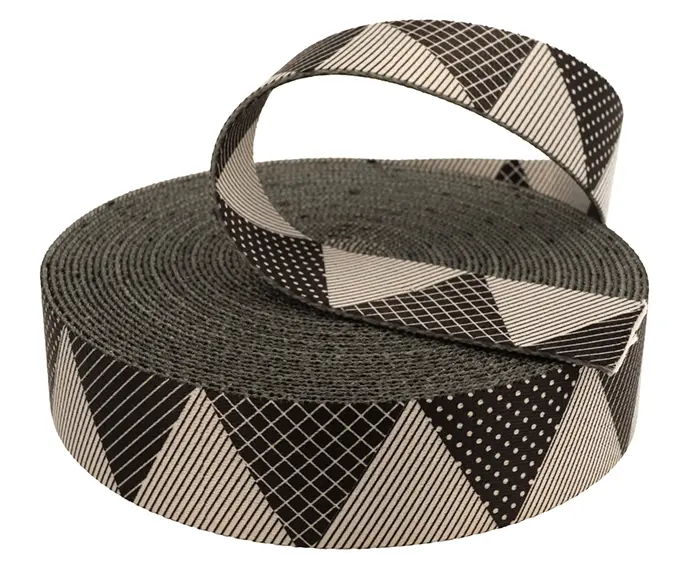 Wzór na taśmie prezentuje zróżnicowaną kompozycję geometrycznych figur na beżowym tle. Widoczny jest zestaw czarnych trójkątów, które są rozmieszczone naprzemiennie w pozycji odwróconej i pionowej, tworząc optyczne złudzenie przypominające tkaninę wertykalną. Pomiędzy trójkątami umieszczono sekwencje drobniejszych kropek, które dodają subtelności i tekstury, oraz kratę tworzącą dodatkową warstwę wzoru. Elementy te razem tworzą dynamiczną i nowoczesną mozaikę, która może przypominać zarówno współczesne grafiki cyfrowe, jak i tradycyjne motywy etniczne. Wzór wydaje się być precyzyjnie zaprojektowany z myślą o zastosowaniu w modzie i akcesoriach, oferując zarówno wizualną głębię, jak i wyrafinowaną elegancję.