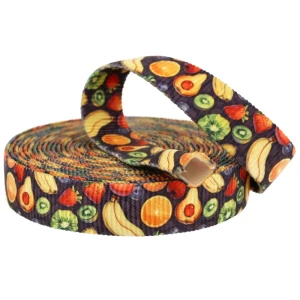 Wzór na tej taśmie to soczysta i kolorowa kompozycja różnorodnych owoców. Znajdują się tutaj wyraźne i barwne ilustracje truskawek, bananów, kiwi, awokado, pomarańczy oraz jagód, wszystkie umieszczone na ciemnoniebieskim tle, które doskonale podkreśla ich żywe kolory. Każdy owoc jest przedstawiony z dużą dbałością o detale, co sprawia, że wzór jest dynamiczny i pełen życia. Ta taśma z owocowym motywem idealnie nadaje się do użycia w projektach związanych z modą, akcesoriami kuchennymi, a także jako element dekoracyjny w przestrzeniach związanych z jedzeniem i gotowaniem. Jest to wzór, który z pewnością przyciągnie uwagę i doda świeżości oraz witalności do każdego przedmiotu, na który zostanie nałożony.