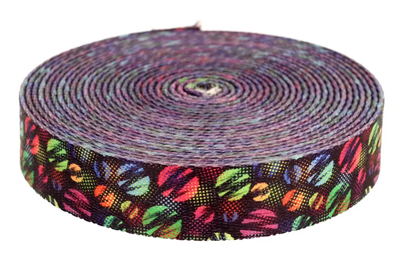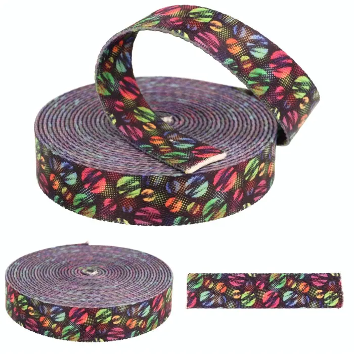 Wzór na taśmie nośnej charakteryzujący się bogatą kolorystyką i dynamicznym układem. Motyw składa się z szeregu kolorowych kulek, które są zróżnicowane pod względem wielkości i kierunku, tworząc wrażenie ruchu i naturalnego piękna. Barwy kulek obejmują intensywne odcienie czerwieni, różu, zieleni, niebieskiego, pomarańczowego i żółtego, które wyłaniają się z ciemnego, prawdopodobnie czarnego tła, pokrytego drobnymi, jasnymi akcentami przypominającymi kropki lub koraliki. Ta wzorzysta taśma może wydawać się ożywiona i wibrująca, nadając jej unikalny i atrakcyjny charakter. Idealnie nadawałaby się na akcesoria mody, które mają na celu wyróżnienie się i dodać odrobinę ekstrawagancji do codziennego stroju.